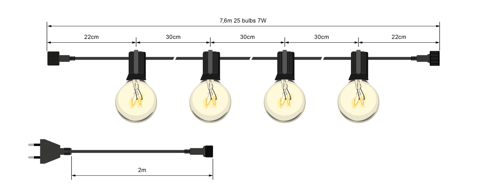 • Długość przewodu zasilającego ( od wtyczki do pierwszej żarówki): 2,22 m